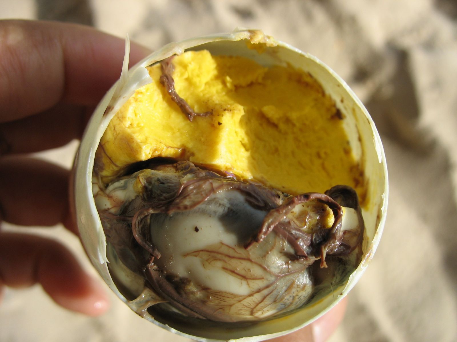 A Trung Vit Lon concluding the embryo which is the most nutritious part and is about to hatch. In fact, it looks grisly to eat. Next, the yolk is soft and has a yellow color. Finally, the white clot is called “Cục Chì” by Vietnamese people.